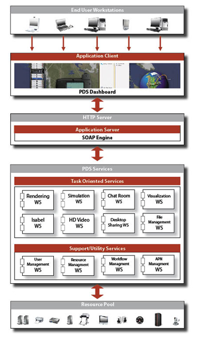 Получившаяся артикуляционная частная сеть (Articulated Private Network - APN) объединяет разнообразные ресурсы, активы и опыт, используя интеллектуальную сеть, которая совершенно безопасна, имеет низкую величину задержек и чрезвычайно высокую скорость. Она обладает возможностью высокоскоростного соединения 10Гбит/с, используя программное обеспечение UCLP (User Controlled LightPath) для управления по запросу и конфигурирования оптической сети. В зависимости от требований пользователя через UCLP конфигурации и управление на различных местах могут быть получены уровни соединения (слой 2 и 3) с увеличением до 1Гбит/с. Доступно стандартное разрешение (270 Mбит/с в один конец) и стандарт H323 (10-30 Мб/с) для опции видеоконференции, а также высокое разрешение (1-1,5Гбит/с) для дистанционного теле-присутствия в реальном времени при анализе таких работ, как чертежи и макеты. Физическая среда является перестраиваемой, и в первую очередь использует экраны и проекционные устройства с высоким разрешением (Рис. 1).