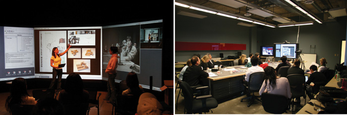 Лаборатория IEL Школы архитектуры и ландшафтного дизайна Университета Пенсильвании располагает тремя панорамными пассивными стереоскопическими дисплеями виртуальной реальности (VR) размером 6 х 8 футов, поддерживаемыми группой графических рабочих станций и программным обеспечением, позволяющим отображать замыслы студентов в VR. Задуманная как недорогая VR альтернатива первому поколению CAVE («пещера») и подобных систем, лаборатория IEL создавалась, чтобы обеспечить поддержку и отобразить рабочие привычки студентов, однако возможности VR часто используются с другими приложениями для моделирования, мультимедиа или презентаций в рамках иммерсивной информационной среды, помимо предполагаемого использования дисплея исключительно в качестве инструмента погружения в VR. Лаборатория IEL также оборудована дистанционной системой «телеприсутствия» со стандартным разрешением (Standard Definition – SD) и подключена к сети APN и связанным с ней ресурсам через 1Гбит/с уровень 3 PacketNet связи с медиа студией CIMS. Пользовательская схема в медиа студии CIMS и лаборатории IEL предполагает, что комплексная мультимодальная платформа наилучшим образом будет работать на этапе оценки процесса проектирования, особенно в условиях сотрудничества (Balakrishnan, Kalisperis и Muramoto, 2006).