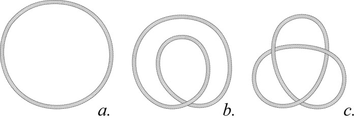Если же процесс образования вложенных петель происходит одновременно с соединением между собой концов стержня, то петли могут оказаться переплетёнными между собой, в результате чего замкнутый стержень станет заузленным, например в виде простейшего узла, называемого «трилистник» (Рис. 4c).
