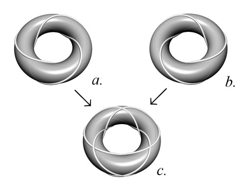 Будучи завязанными вместе на одном и том же торе, они неизбежно будут физически точечно контактировать друг с другом, образуя структуру из двух закрученных в противоположных направлениях замкнутых пространственных спиралей (Рис. 6c).