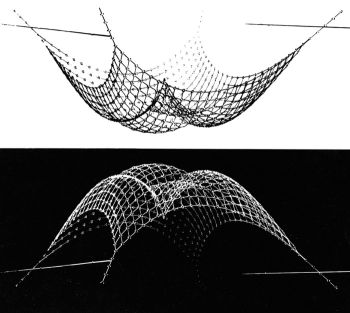 Принцип тканевой структуры нашёл широкое применение как в практическом моделировании сложных криволинейных поверхностей, так и в научной теории. Русский математик академик П. Л. Чебышев в 1878 г. установил математические принципы формообразования криволинейных поверхностей из плоских тканевых развёрток с квадратными ячейками [4], наглядно продемонстрировав, что поверхность шара может быть полностью покрыта двумя изначально плоскими выкройками. Другим важным направлением применения рёберных моделей плоскости в формообразовании криволинейных поверхностей является метод инверсии гибких висячих сетей, формируемых из плоского положения действием силы тяготения. Переворачивание висячей сети образует опорную поверхность безмоментной решётчатой оболочки (Рис. 2).