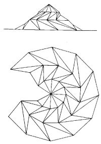 Возможно и разбиение плоскости сплошного листа на отдельные грани (фрагменты плоскости) и соединение их между собой шарнирными связями вдоль граничных рёбер, что приводит к созданию плоских развёрток складчатых поверхностей (Рис. 1). Но данный метод также ограничен: возможны лишь аппроксимации плоскими гранями трёхмерных криволинейных поверхностей (в основном выпуклых). Для более сложных поверхностей требуются плоские развёртки с разрезами и/или наложениями.