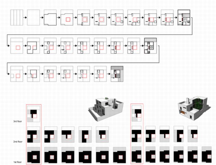More recently, the studio addressed the customization of mass housing. This studio built on previous research aimed at devising a methodology for designing housing systems. (Duarte 2005; Benrós et al. 2007) This methodology encompasses a design system, a building system, and a computer system. The design system encodes the rules for generating solutions tailored to specific design contexts. It determines the formal structure and the functional organization of the house. The building system specifies how to construct such solutions in accordance with a particular technology that is suitable for the context. Finally, the computer system enables the easy exploration of solutions and the automatic generation of information for fabricating and building the houses. It was the first time that this methodology was used in its full extent. In the CAD II, students had already developed programs for exploring solutions within housing design systems conceived by students in a more traditional. However, in the CAAD Studio the conceptual and temporal separation between conceiving the design system and developing the program were blurred, and students conceived the design system by developing a computer program. (Figure 5) This was exactly the sort of approach that was sought when these classes were devised. Computer-based media has become a way of stimulating creative design thinking and engaging students in a reflective practice as proposed by Schon. The detailed account of the housing design methodology just mentioned will be the theme of a future publication.