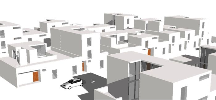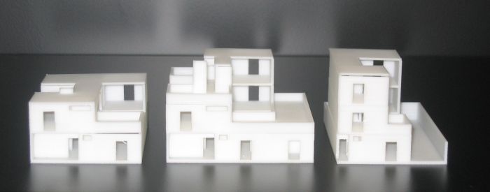 Fig. 5(a-c).: CAAD: Computer Aided Architectural Design. Design system for customized housing conceived by programming it in Autolisp. (Luís Rasteiro, Joana Pimenta, and Pedro Barroso 2005/06). Explanation of how rules are applied in the generation a solution, partial universe of design solutions, view of a street generated using the program, and FDM models of solutions.