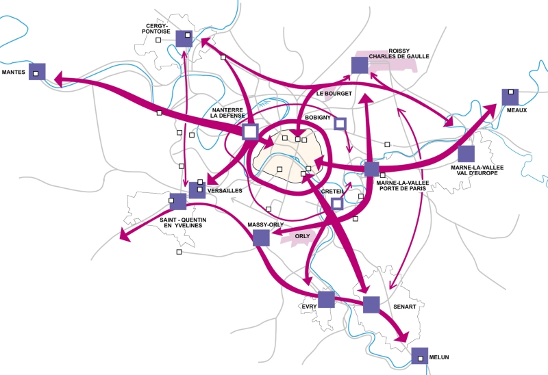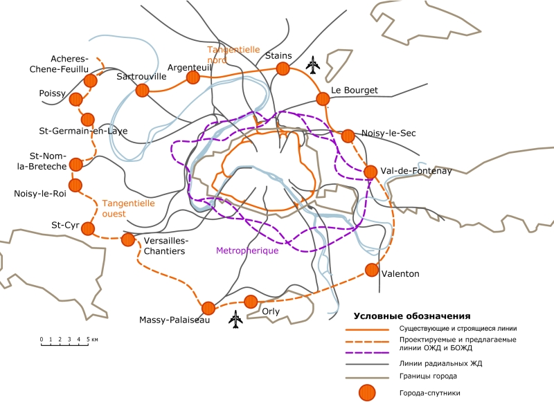 У Парижа, например, до недавнего времени было «колонизаторское» отношение к пригородам, подразумевающее вынос объектов обслуживания за пределы внутреннего города (например, в район La Défense). Это повлекло за собой однообразие развития ткани города, а затем многочисленные транспортные проблемы, особенно в западной части города, связанные с доставкой рабочих к местам приложения труда. Эти проблемы, как правило, решались стихийно чиновниками, далекими от вопросов градостроительства. Парижская «корона» (границы города и пригородов) концентрирует сегодня большое количество социального жилья, часто неприспособленного к современным потребностям, а изолированность таких районов не может привлечь инвестиции. Невозможность совмещения пассажиро- и грузоперевозок из-за недостатка путей (только 2 пути) повлекла постепенное сокращение перевозок, а неравномерно развивающиеся пригороды снижали интерес пользования ОЖД. Проект развития малой парижской «короны» 2007 г. включает реконструкции наиболее проблематичных северо-восточных территорий вдоль бывшей ОЖД. Именно этот участок дороги слабо использовался и не был включен в проект реконструкции железнодорожных сетей, как южный и западный участки, что повлекло за собой изолированность и деградацию северо-восточных районов Парижа. При этом бывшая окружная железная дорога могла бы стать важнейшим фактором в решении сложившихся градостроительных, социальных, экономических, экологических проблем парижских пригородов малой и большой «короны» (границы Большого Парижа и Иль-де-Франс). На сегодняшний день в Париже существует проект замыкания структуры БОЖД (так называемых «тангенциальных» линий), которая свяжет города-спутники Парижа. (Рис. 2). Идея БОЖД как орбитальной инфраструктуры конурбации (полицентрической структуры агломерации), связывающей города-спутники Парижа, возникла еще в 1990-е годы. Сегодня этот проект претворяется в жизнь. (Рис. 3)