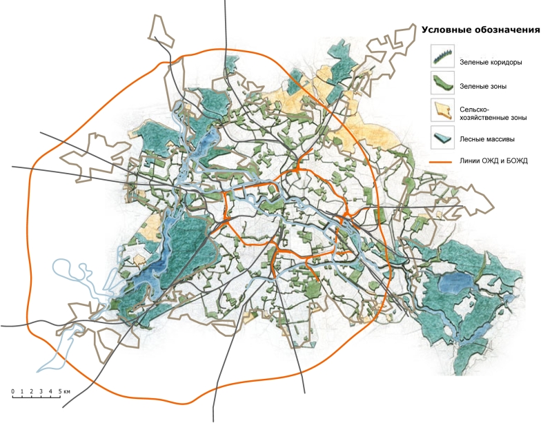 Проблема прилегающих к ОЖД территорий существует в Москве уже давно. За всю историю существования дороги, обеспечивающей только грузоперевозки, эти территории все больше насыщались промышленными предприятиями. Большое количество этих предприятий еще сохраняют свои функции, и введение пассажирского движения без значительной реконструкции ОЖД и прилегающих территорий представляется невозможным. Вынос предприятий за пределы МКАД и создания пром-сити повлечет за собой перегруженность транспортных сетей при том, что количество грузов, которое сегодня распределяется вдоль ОЖД, не изменится, и поезда продолжат использовать ОЖД для доставки грузов в новый район за неимением другой железнодорожной инфраструктуры. Использование БОЖД под грузоперевозки, обеспечивающие функционирование предприятий Москвы представляется нерациональным, так как значительно увеличится пробег поезда, что повлечет большие финансовые потери. Таким образом, прежде, чем решать, когда вводить на ОЖД пассажирское движение, необходимо преобразовать прилегающие территории таким образом, чтобы сохранить разнообразие городской ткани, насыщая ее различными функциями – не только жилыми, но и промышленными, коммерческими, общественными - и рационально организовать вывод крупных предприятий с возможным строительством для них дополнительной железнодорожной инфраструктуры, позволяющей совмещение пассажирского и грузового движения и соединяющей крупные города и аэропорты напрямую. Эта новая инфраструктура, а также существующая БОЖД, сделали бы пригороды Москвы, а также ее города-спутники, более привлекательными для проживания, работы и, соответственно, для инвестиций в их развитие, разгрузили бы общегородской центр. А при наличии жесткого градостроительного регулирования, предусматривающего сохранение естественных и искусственных зеленых массивов между городами-спутниками, могли бы создать «зеленые пояса» вокруг Москвы и стать частью динамичной орбитальной структуры Москвы как конурбации. (Рис. 8)