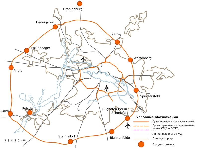 В Берлине же пошли по пути развития инфраструктуры ОЖД в совокупности с развитием многофункциональности городской ткани и прилегающих к ОЖД территорий. Идея ленточного развития территорий вдоль ОЖД означала, что каждый район города, по которому она проходит, получал свой набор разнообразных функций: жилых, общественных, промышленных, и обеспечивал в каждом районе баланс трудовых ресурсов и мест приложения труда. Сегодняшние проекты развития ОЖД включают организацию «зеленого пояса» вдоль ОЖД (комплекса небольших парков и садов), а также «пояса коммерции» (развитие промышленных и коммерческих предприятий вдоль ОЖД) и научно-исследовательских институтов. (Рис. 4). ОЖД Берлина имеет 4 пути, что позволяет совмещать на ней пассажиро- и грузоперевозки и отвечать всем требованиям современного города. Сегодня Берлин имеет БОЖД, построенную изначально как обходная линия для Западного Берлина, и соединяющую города-спутники Берлина.