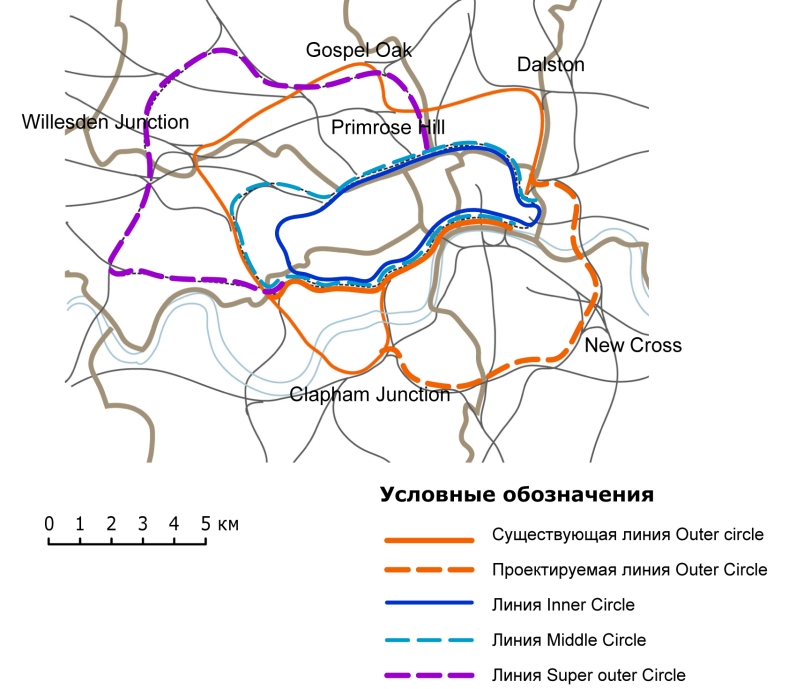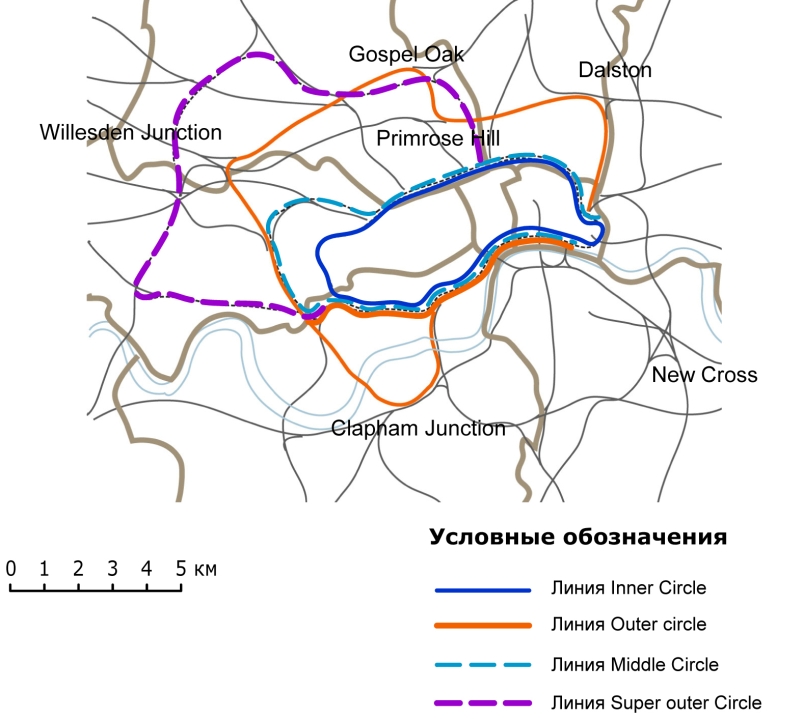 В Лондоне в XIX веке существовало 4 кольцевых и полукольцевых маршрута ОЖД. (Рис. 6). Лондон в то время был намного меньше, чем сегодня, и большинство коммерческой и промышленной деятельности было сосредоточено в центре. Таким образом, линии ОЖД, использовавшиеся главным образом под транзитные грузоперевозки и не проходящие вдоль промышленных и коммерческих предприятий, были не в состоянии привлечь большое количество пассажиров, и движение на них постепенно сокращалось, пока на отдельных участках не было закрыто совсем. С ростом Лондона и возникновением новых мест приложения труда за пределами центра возникла проблема нехватки орбитальных и полуорбитальных связей между радиальными линиями. Подземные линии не обеспечивали возможности перевозки грузов, и была принята идея о замыкании бывшей линии Outer circle. Таким образом, в Лондоне «пошли от обратного»: имея разнообразную многофункциональную городскую ткань, пришли к выводу о необходимости прямых связей между городскими районами и замкнутой ОЖД. (Рис. 7)