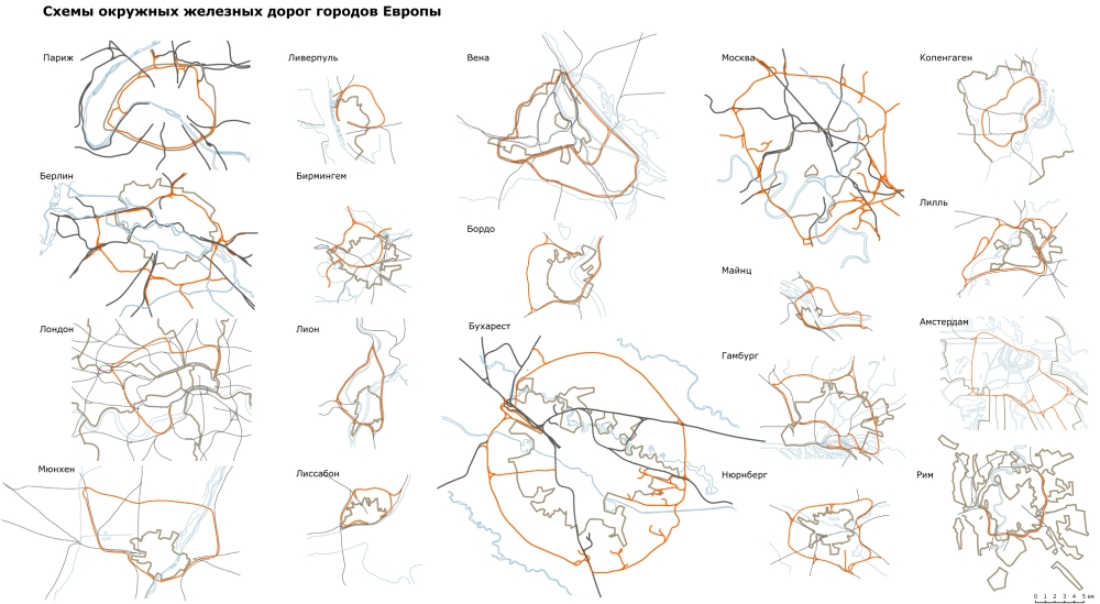 Рис. 1. Схемы окружных железных дорог городов Европы (границы города обозначены на момент строительства ОЖД) |