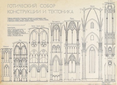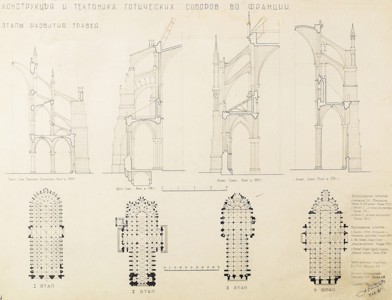 Рис. 1(а,b). Учебная работа по сравнительному графическому анализу конструкции готических храмов, выполняемая студентами МАРХИ по методике Ю.Н. Герасимова