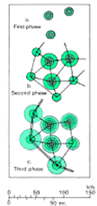 Социальные утопии, являвшиеся основой формирования классических градостроительных систем начала ХХ века (линейной, центрической, решетчатой), стремились к созданию идеального общества, построенного на равновесии и имеющего статичную иерархическую структуру. К. Доксиадис, создавая Экуменополис, делает попытку рассмотреть характер и способы регулирования внутренней динамики города. Он отказывается от принципов децентрализации, реализованных в проектах городов – спутников (Г. Майер) и утверждает необходимость создания новых центров, равных или превосходящих по значимости уже существующие. Необходимость подобной «новой централизации» связывается с необходимостью идеологически и демографически разгрузить уже существующие города. Таким образом, Доксиадис фактически постулирует необходимость наличия не только гибкой системы городов, но и динамичной системы их центров или доминант, но внутренняя структура города остается в его концепции статичной. (Рис. 1(a, b))