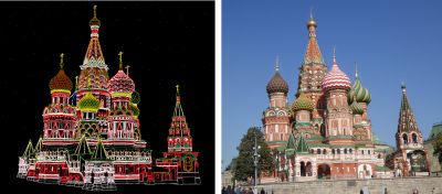 Целью настоящей работы была проверка на практике современных средств компьютерного моделирования в режиме реального времени. Для этого мы выбрали одно из самых красивых и геометрически сложных сооружений в мировой архитектуре - Храм Василия Блаженного в Москве. В результате проделанной работы была создана компьютерная модель внешней части этого здания. В настоящий момент с ней проводится дальнейшая работа как по совершенствованию и уточнению геометрии, так и по визуализации, причем не только фотореалистичной, но и художественной.