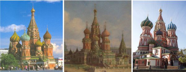 Рис. 1(a,b,c): a). Храм Василия Блаженного 1990-е годы, b). Картина неизвестного художника XIX века – окраска собора отличается от нынешней, c). Современный вид с северо-востока