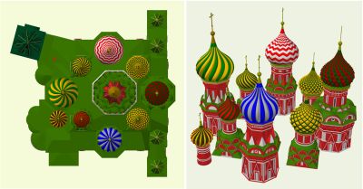 Другая причина некоторой нестыковки реального и компьютерного изображений – сам прототип, то есть Храм Василия Блаженного. Его геометрия, как и все существующее в этом мире, имеет отклонения от идеального. Там, где создателям храма надо было выйти на нужную отметку, исправляя неточности прежних расчетов или ошибки возведения, они выходили на нее, жертвуя прямолинейностью фасадных элементов. Да и некоторые оси (например, колокольни) имеют отклонение от вертикали, что неминуемо вносит нюансы во внешний вид всего сооружения. Таким образом, компьютерная модель, даже при всем старании авторов, является некоторым приближением (даже «идеализацией») модели реальной и не несет в себе всей информации о ней. То есть, к сожалению, потеря некоторых данных о реальном объекте при компьютерном моделировании неизбежна.