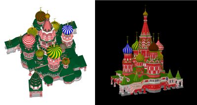 Для удобства дальнейших работ по цветовым экспериментам и визуализации и для взаимодействия с другими программами составные части компьютерной модели Храма Василия Блаженного сразу разделялись по слоям в зависимости от используемых в их прототипах материалов (кирпич, штукатурка, железо и т.п.).