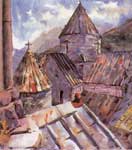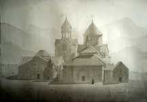 Существует несколько типов отмывок. Первая и самая простая — черно-белая тушь или сепия, по сути напоминающая гризайль. Ее пример на приведенном рядом задании I курса — отмывке армянского монастыря Ахпат. Для сравнения даем односеансную акварель другого армянского памятника. Если на отмывке главное внимание уделяется чертежу, выявлению объемов и силуэту архитектуры, то на этюде — состоянию и цвету. Очень важен выбор точки зрения. На отмывке желателен самый характерный ракурс. Выбирается место, откуда силуэт сооружения смотрится более выразительным, и практически видны все главные части.