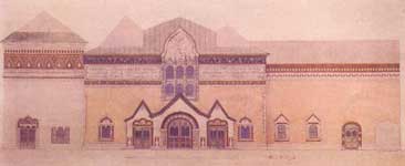 | В.Васнецов. Проект фасада Третьяковской галереи. Акварель, тушь, перо. | Л. Бакст. Уриэль Акоста. Акварель | Л. Бакст. Елена. Эскиз костюма к трагедии «Елена в Спарте». Карандаш, акварель. |